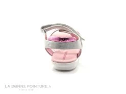 Cette sandale d’Ă©tĂ© est gris mĂ©tallisĂ©, avec un empiècement rose mĂ©tal Ă l’arrière, un un vĂ©lo (rose aussi !) brodĂ© sur le devant.