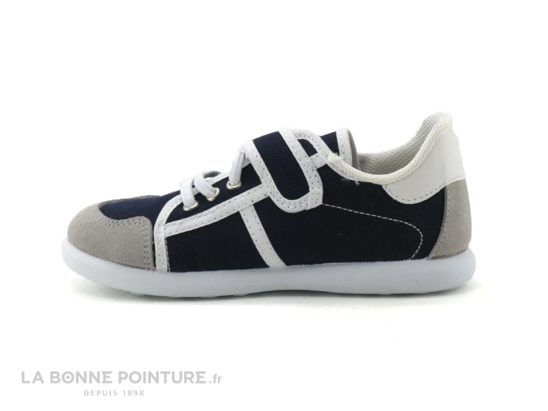 Ces tennis enfant sont principalement en toile bleu marine, avec le pourtour blanc et les extrémités gris velouté.