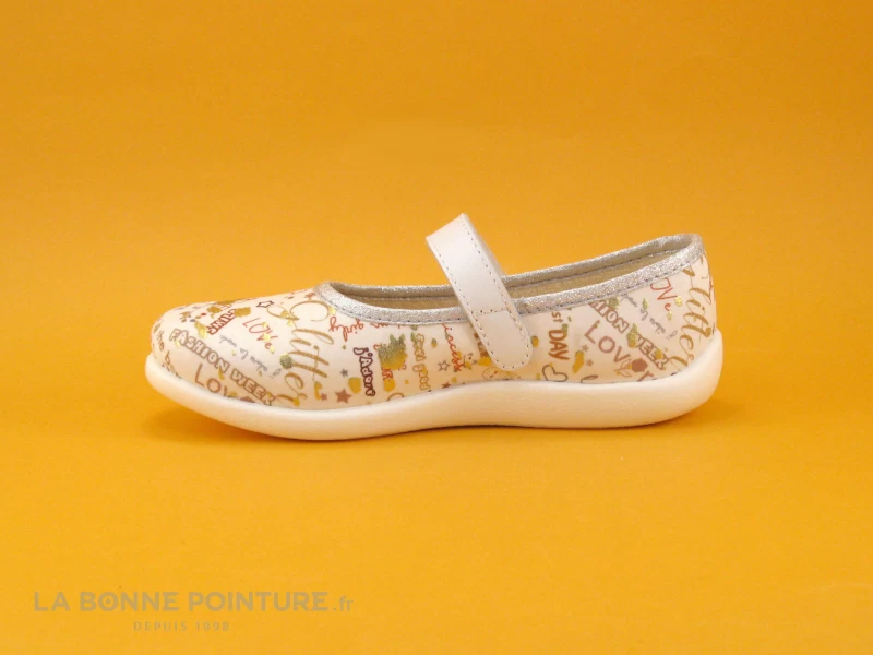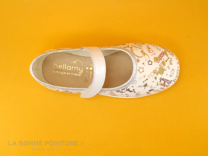 Ce chausson enfant Bellamy Norea est en textile blanc imprimĂ© d’Ă©critures fantaisie et tachetĂ© de dorĂ©. Un liserĂ© argentĂ© apporte une jolie finition Ă la chaussure Bellamy.