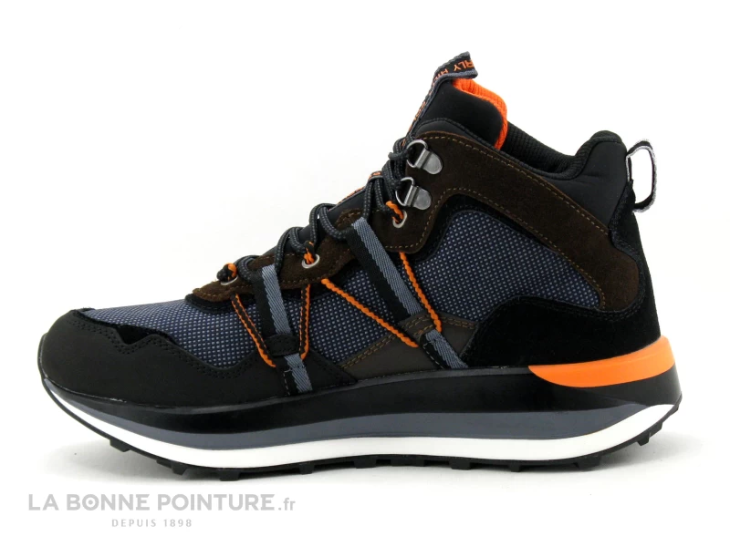 Cette basket montante Homme BHPC mĂ©lange cuir et textile aux tons de marron chocolat, de noir, de gris et d’orange.