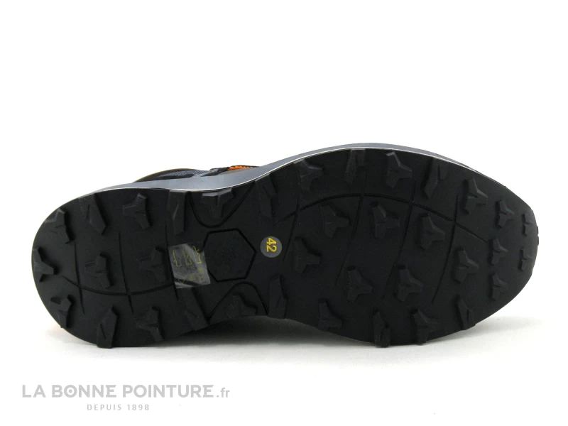 La semelle de marche est Ă©paisse et crantĂ©e avec BHPC inscrit en gris et une ligne orange Ă l’arrière.