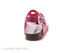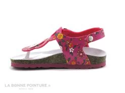 Cette chaussure d’été fillette est en simili cuir rose fuchsia à petites fleurs.