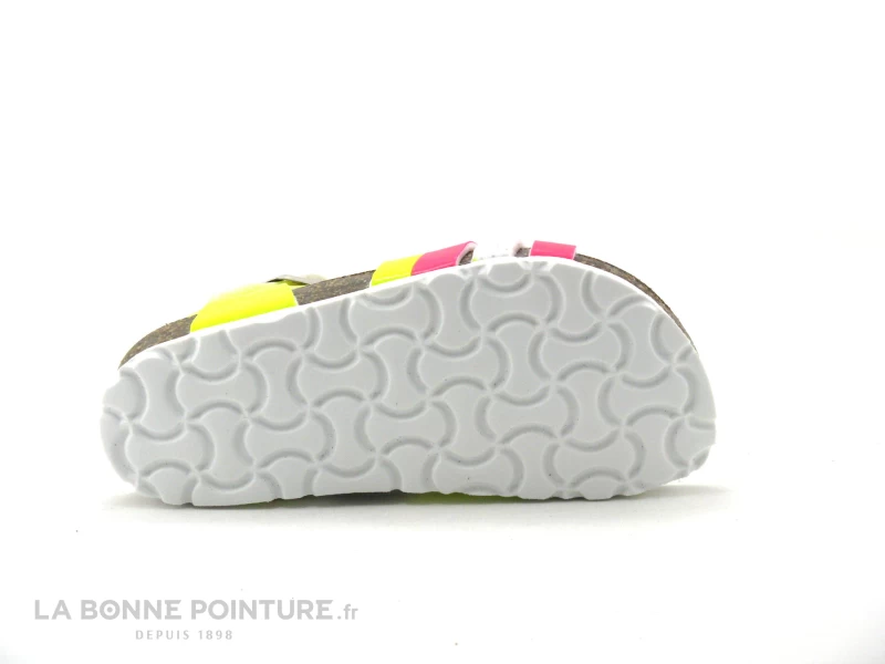 Ce nu-pieds enfant Biomodex combine du jaune et du rose fluo, avec des lanières fleuries à petits pois argent.