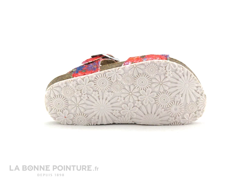Ce nu-pieds réglable enfant fille est rose / rouge pailleté, avec des fleurs vertes et violettes.