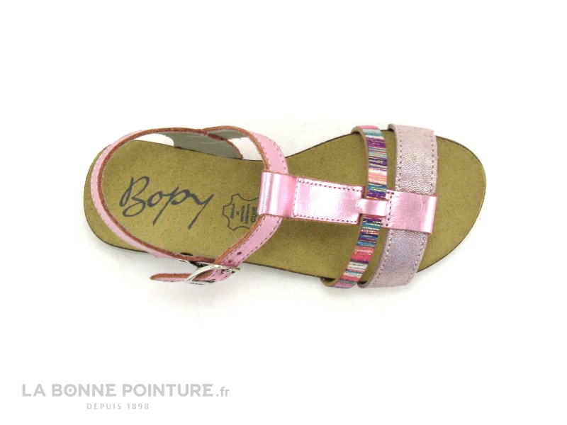 Cette sandale mode enfant Bopy Ecoco est en cuir avec 2 lanières fantaisie sur l’avant, qui traversent la bride salomé.