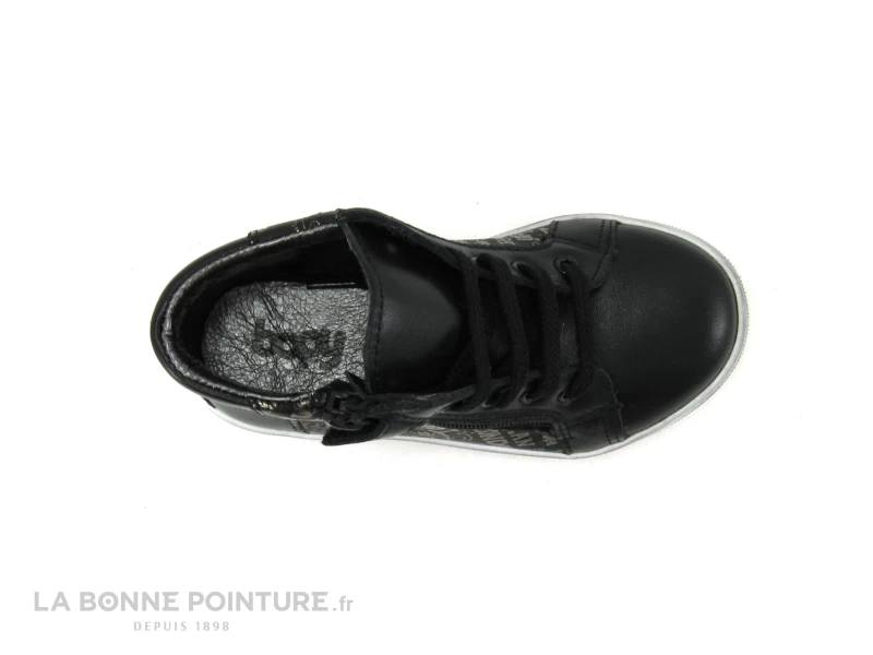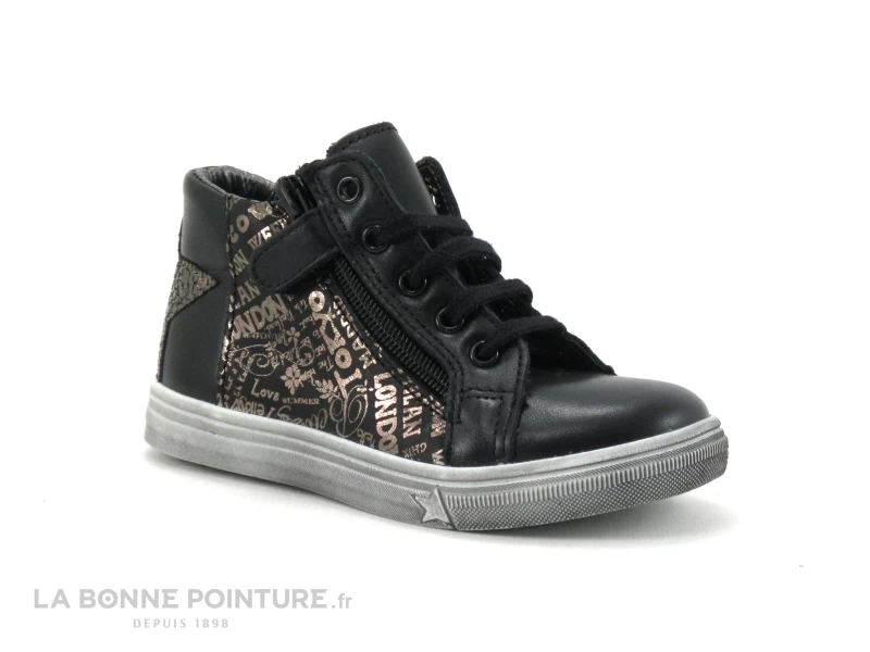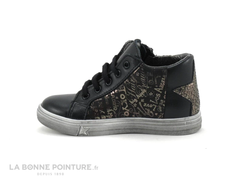Cette basket montante fille Bopy mélange un cuir lisse noir avec un cuir imprimé or sur les côtés.