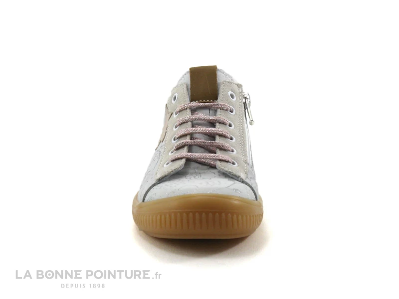 La fermeture éclair côté opposé permet de fermer rapidement les sneakers fille Bopy Sanpaoli, qui s’ajustent au pied de l’enfant avec le lacet rose et argent.