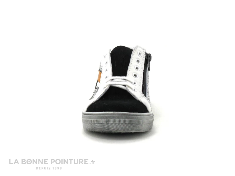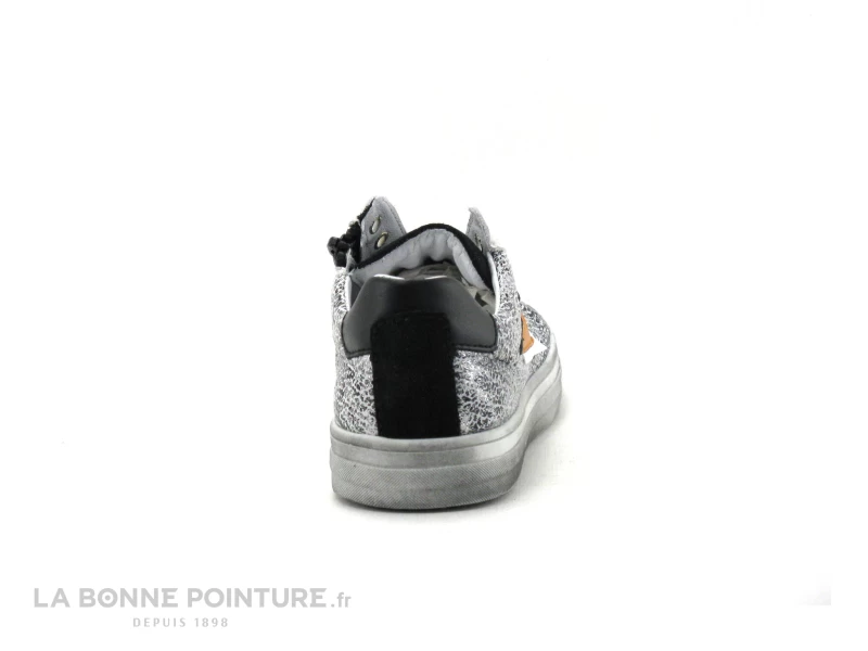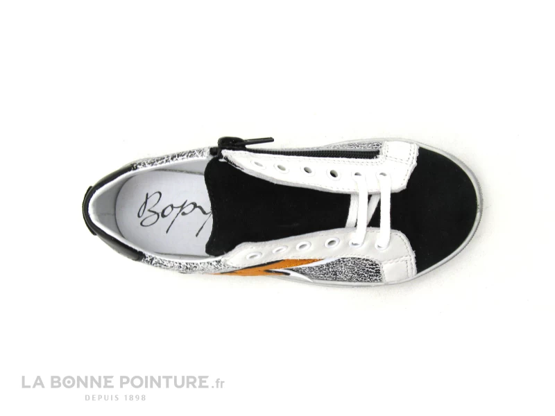 Cette basket de ville fille Bopy mélange un cuir velours noir, un cuir blanc et un cuir imprimé argenté, avec un peu d’orange métallisé sur le côté.