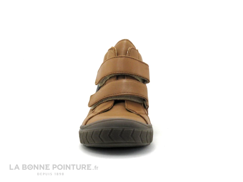 Cette chaussure montante enfant Bopy est en cuir lisse marron caramel, ornĂ©e d’une Ă©toile bleu marine sur le cĂ´tĂ© externe.