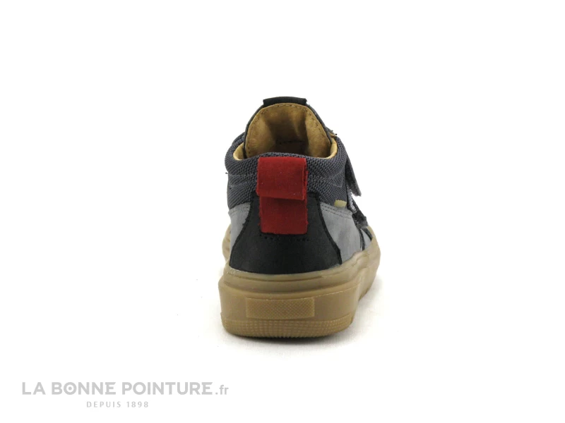 Cette chaussure montante garçon est en cuir velours gris, avec un peu de noir et de rouge à l’arrière.