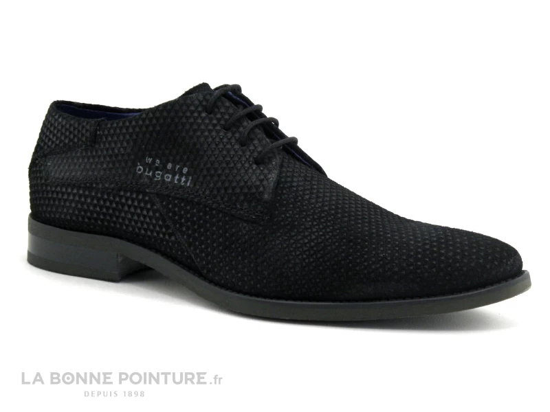 Ce derby Homme est en cuir velouté noir, avec de petits triangles en relief et un aspect irrégulier et nuancé (used look) qui caractérise les chaussures Bugatti.