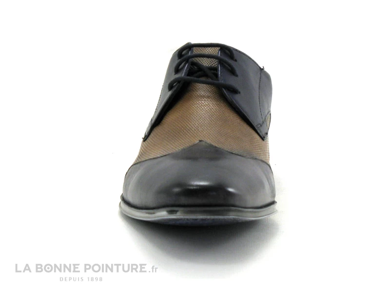 Ce derbi habillé Homme combine du cuir beige, noir grisé et bleu marine.