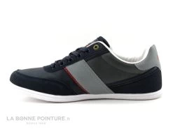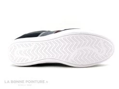 Cette basket basse Homme est bleu marine, avec une large bande rayée grise sur les côtés, bordée d’une ligne rouge.