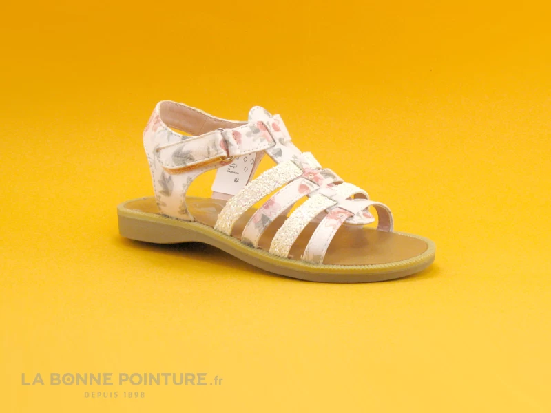 Ce nu-pieds spartiate enfant est blanc imprimé de fleurs aux tons de rose et de vert, avec des lanières pailletées.