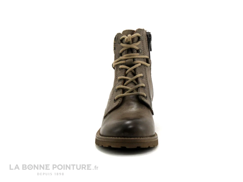 Cette bottine fille est en cuir nuancé marron et beige, avec un col fantaisie en textile.