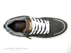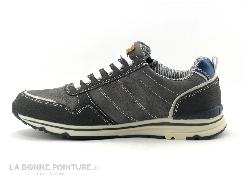 Ces sneakers Homme avec semelle amovible sont en simili cuir gris, avec du bleu marine Ă l’arrière.