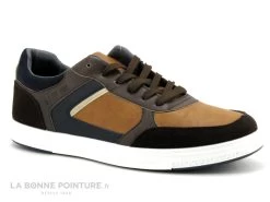La basket basse DT New York mélange des empiècements marron clair et marron camel, avec un peu de bleu marine.