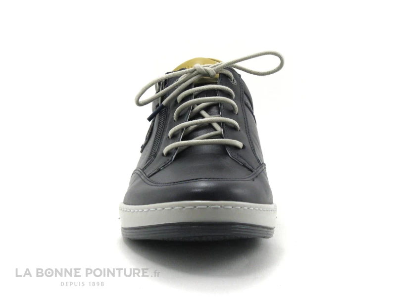 Les petits empiècement jaunes sur la languette et Ă l’arrière caractĂ©risent un peu plus ces belles baskets en cuir bleu Fluchos Etna F0148.