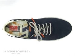 Cette basket de ville Homme Fluchos est en cuir velouté bleu marine finement poinçonné, avec un peu de blanc cassé et d’orange.