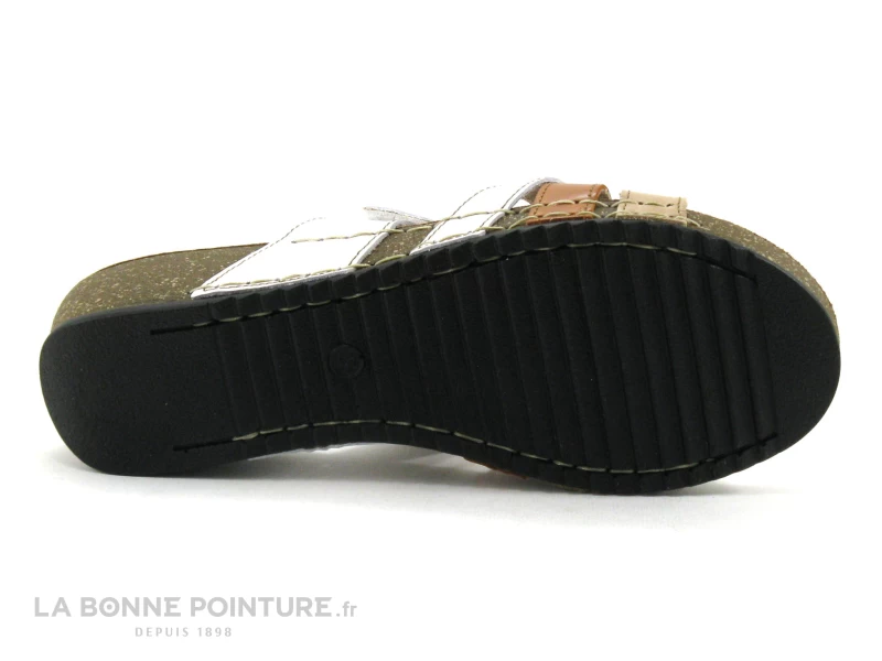 Cette mule anatomique Femme Fly Flot mélange cuir blanc, cuir marron et cuir beige.