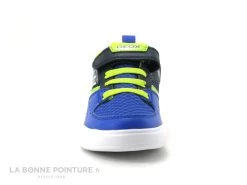 Cette chaussure garçon avec lumières clignotantes Geox J35GVA est en textile et matières synthétiques résistantes bleu royal, bleu marine et vert lime.