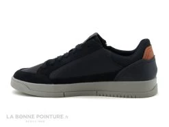 Cette basket basse bleu marine Geox combine cuir et matières synthétiques résistantes, avec une partie en nylon autour de la cheville et un empiècement camel à l’arrière.
