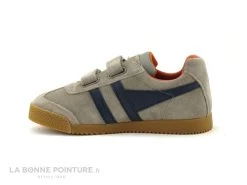 Ces baskets basses enfant Gola sont en cuir gris/beige (rhino), avec des bandes bleu marine sur les côtés et l’intérieur orange.