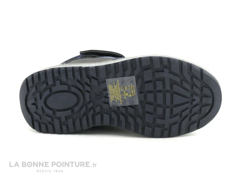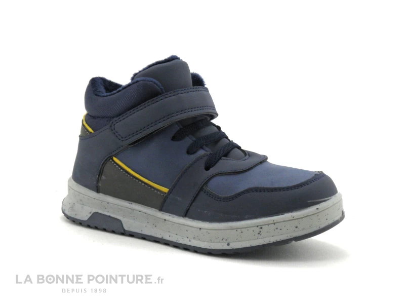 Cette basket montante garçon intérieur chaud est bleu marine avec un peu de gris et de jaune.