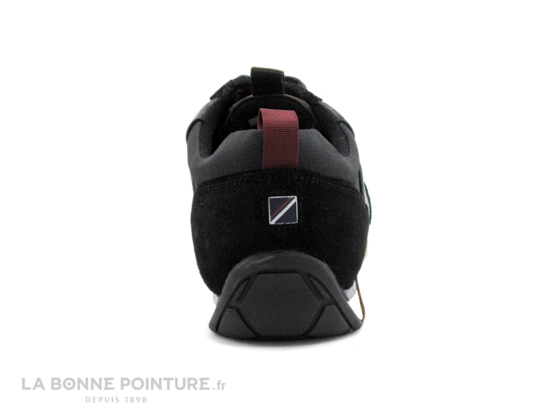 Cette basket basse est en cuir lisse et nubuck noir, avec la languette en textile marron foncé, et une touche de bordeaux à l’arrière de la chaussure.