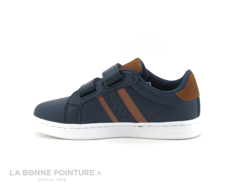 Cette basket enfant pas chère est en simili cuir bleu marine, avec des parties marron camel et la languette en textile.
