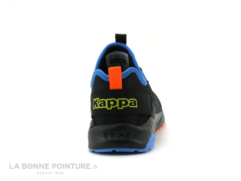 Un large élastique noir habille l’arrière de la chaussure de sport enfant, marqué Kappa en jaune.