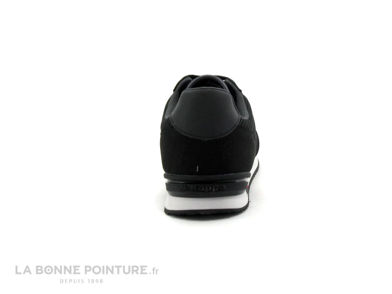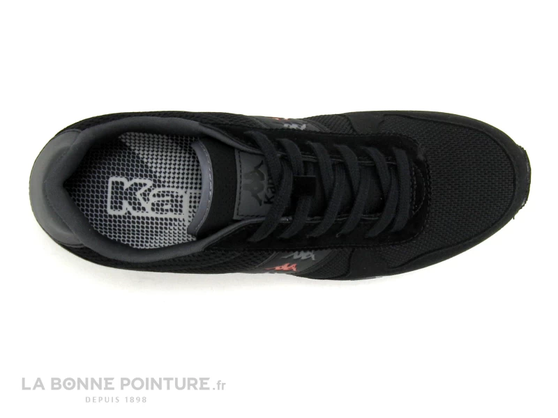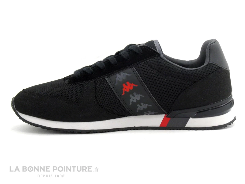Cette basket de ville est en textile et matières synthétiques noirs, avec le contrefort gris et le logo Kappa en rouge sur les côtes.