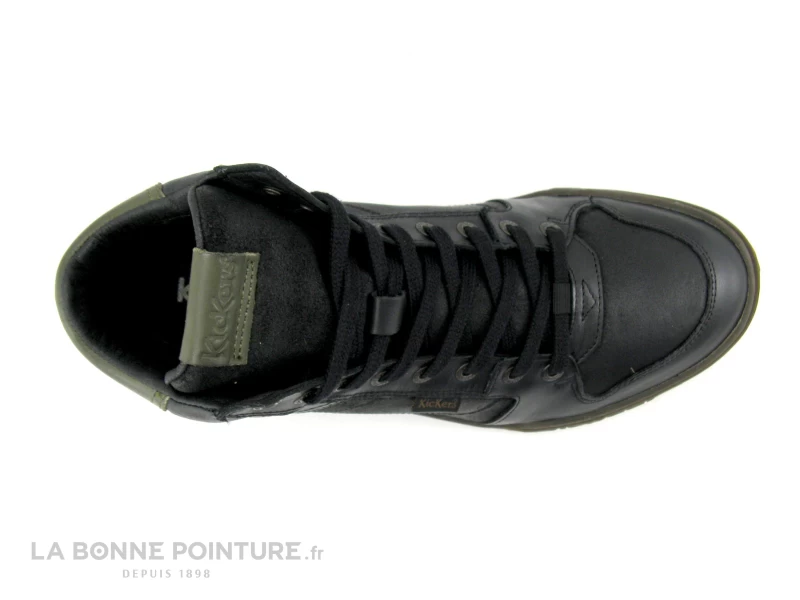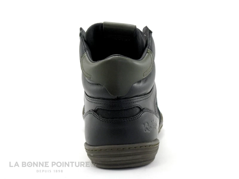 Cette chaussure montante Homme Kickers est en cuir noir, avec une partie kaki à l’arrière et sur la languette gravée Kickers.