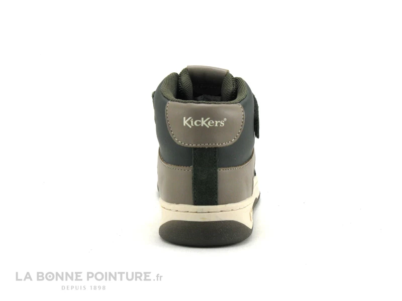Cette basket montante enfant Kickers mélange cuir velours et matières synthétiques résistantes aux tons de kaki, de jaune et de beige.