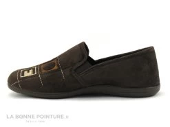 Ce chausson Homme est en velours marron chocolat, avec l’inscription HOME sur le devant de la chaussure.