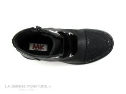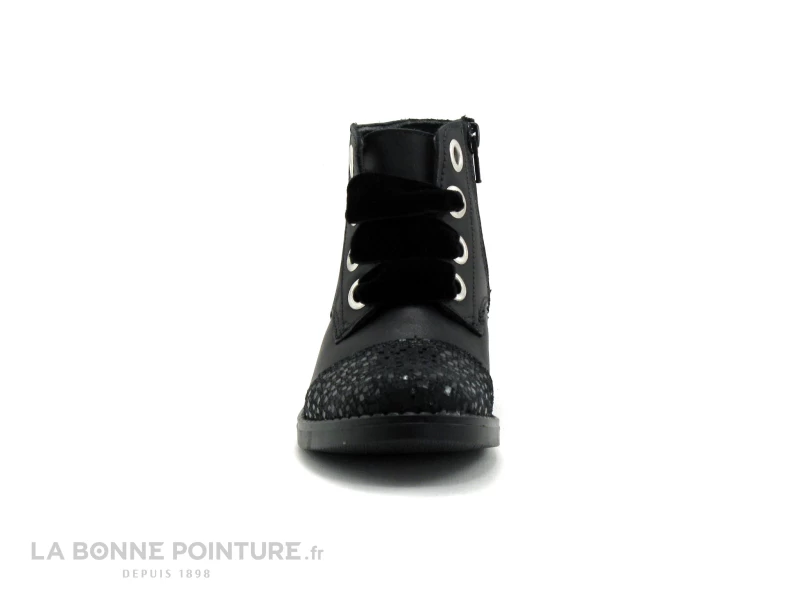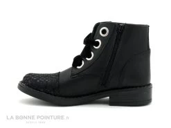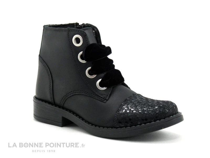 Ces boots enfant sont en cuir lisse noir, avec la pointe en cuir velouté brillant.