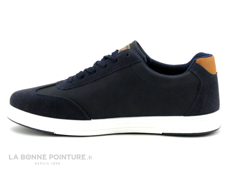 Cette basket basse Homme bleu marine est ornée de bandes marron sur le côté externe, avec un peu de camel à l’arrière.