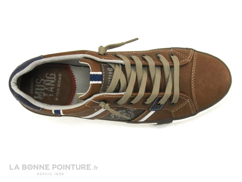 Cette tennis Homme Mustang True Denim est marron clair aspect grainé, avec les côtés finement poinçonnés et du bleu marine à l’arrière.