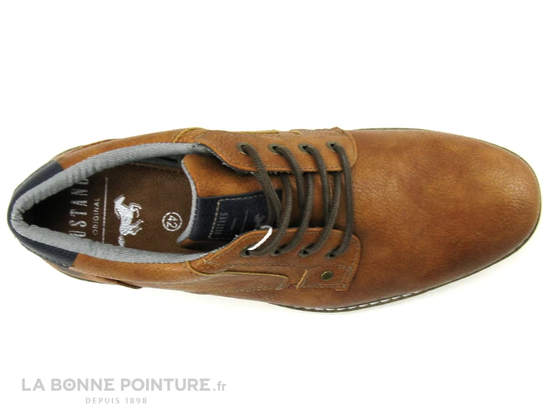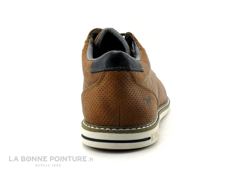 Cette chaussure à lacet Homme Mustang 4150 est en simili cuir marron cognac avec un bel aspect grainé, des parties poinçonnées et du bleu marine.