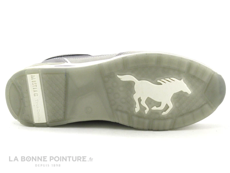 La semelle de marche des baskets ville Homme grises Mustang est souple, blanc cassé avec une fine ligne bleue à l’arrière.