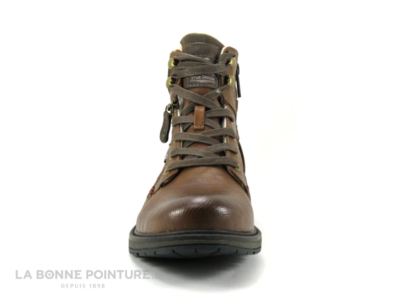Cette chaussure montante Homme Mustang True Demin est en simili cuir marron cognac, grainé et nuancé.