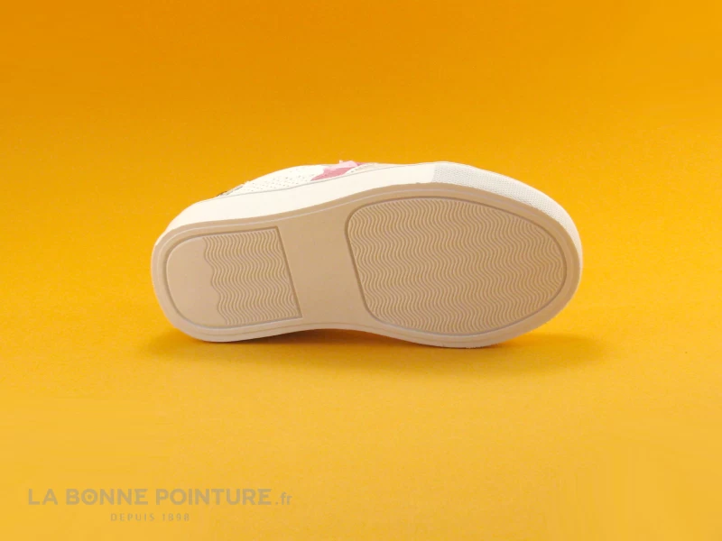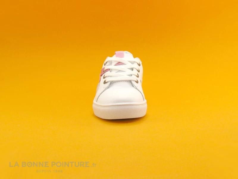Cette paire de baskets enfant à petit prix est en simili cuir blanc, avec des touches rose brillant et argent.