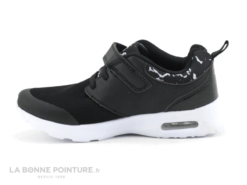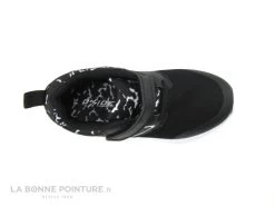 Cette chaussure fille ou garçon est en textile et matières synthétiques noirs, avec l’encolure la languette noires et blanches.