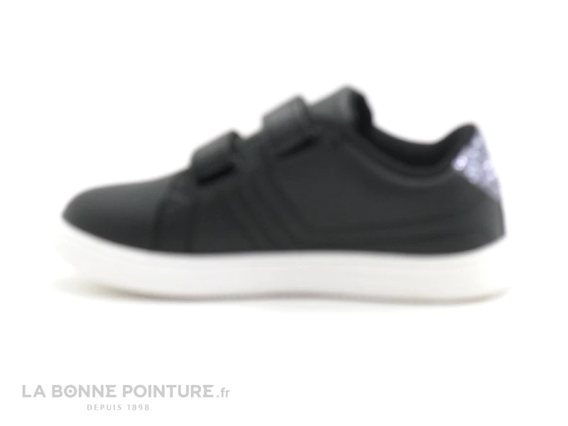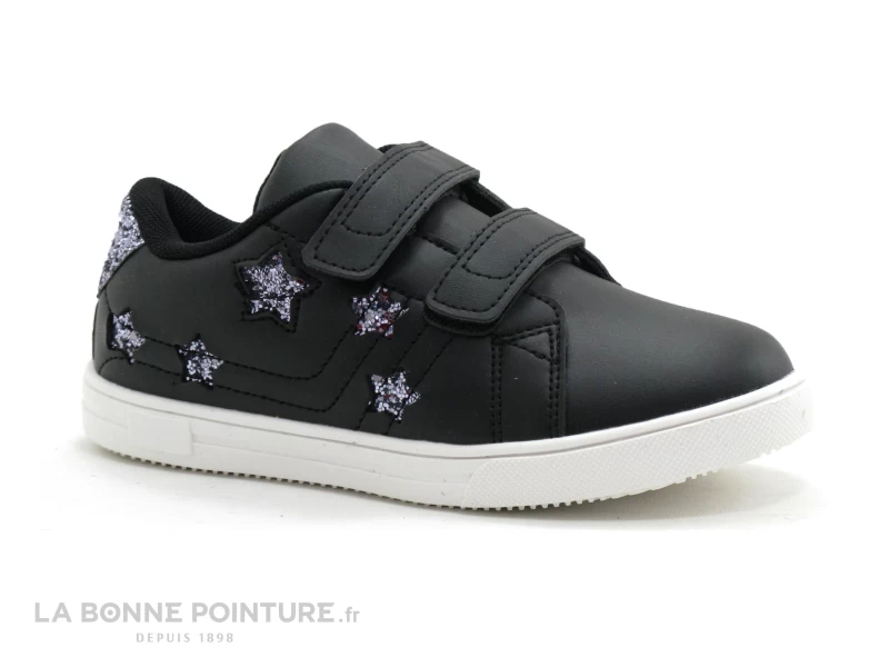 Ces sneakers enfant à petit prix sont noir mat, avec des étoiles pailletées argent sur le côté, comme le contrefort à l’arrière de la chaussure.