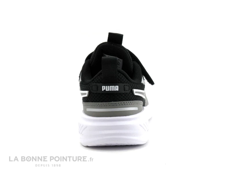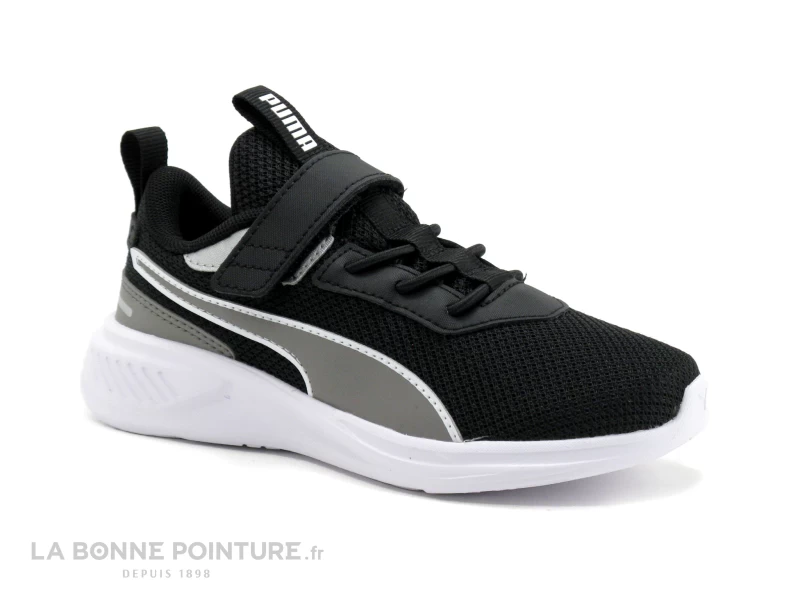 Cette chaussure de sport enfant Puma est en textile respirant noir, avec du gris sur les côtés.