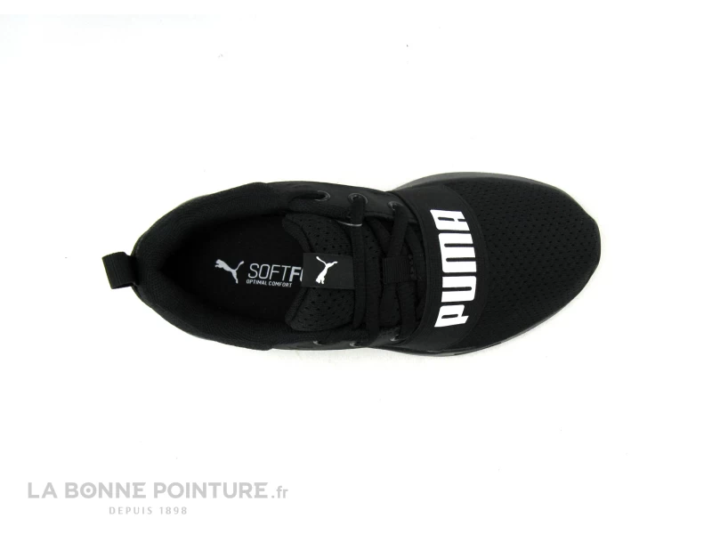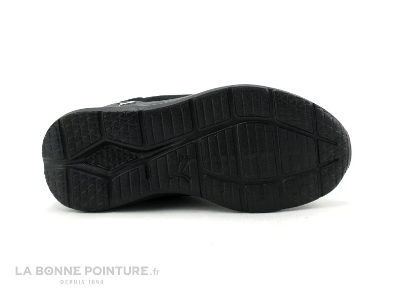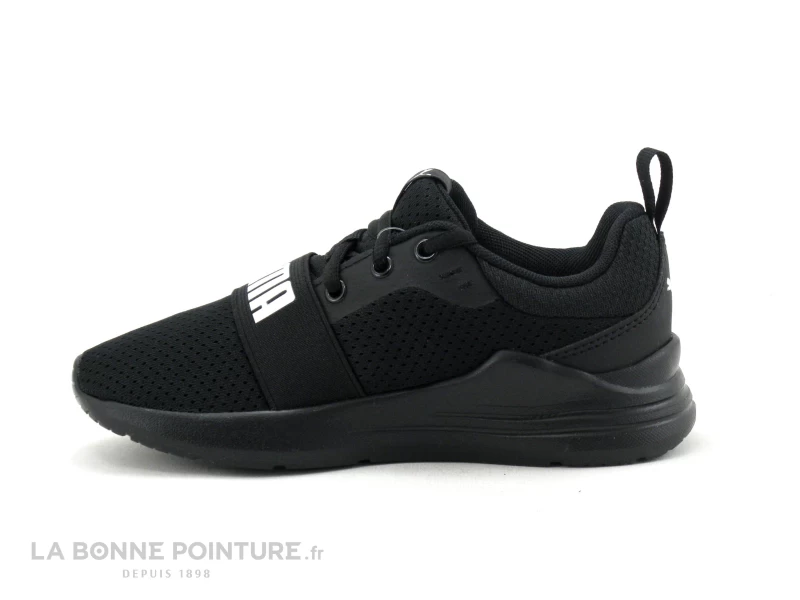 Cette basket enfant pour le sport ou pour le quotidien est en textile aĂ©rĂ© noir, avec un Ă©lastique noir sur l’avant marquĂ© Puma en blanc.