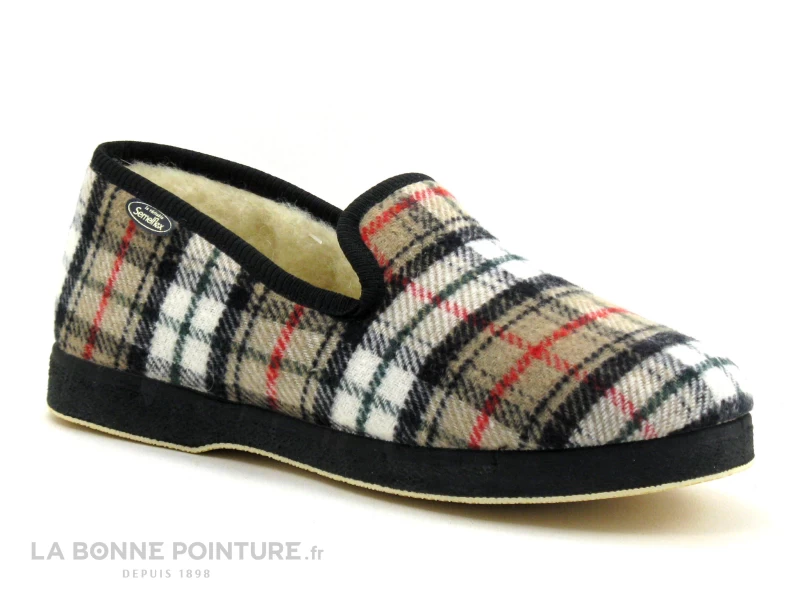 Ce chausson Homme Semelflex est en textile écossais aux tons de beige, de blanc cassé et de noir, avec de fines rayures rouges et vertes.