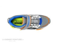 Ces sneakers Skechers enfant sont en textile et matières synthétique gris, avec des touches de turquoise, d’orange, de jaune et de noir.
