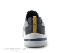 Ces sneakers Vegan Homme Skechers sans lacet sont en textile maille grise, avec du bleu marine au niveau du contrefort.