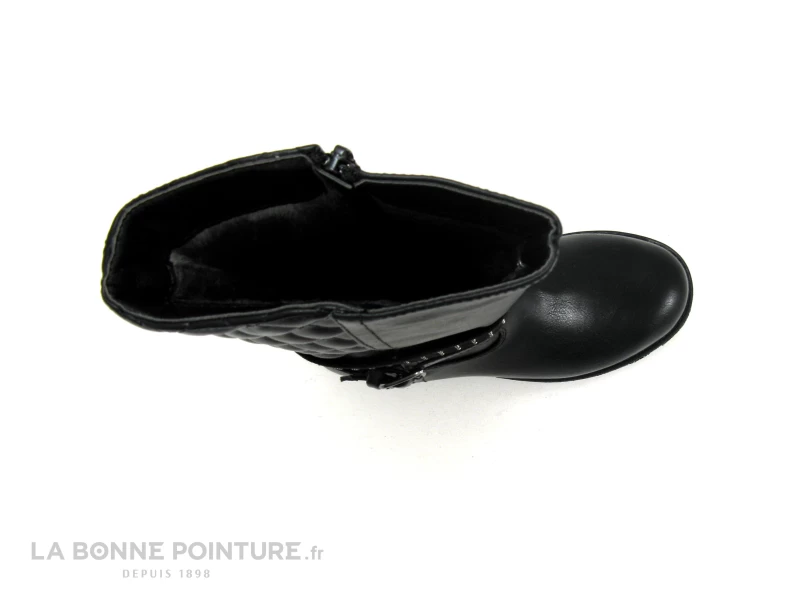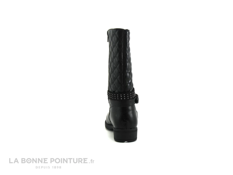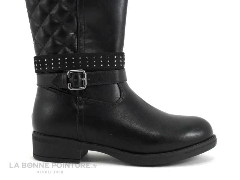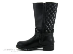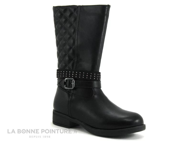 Cette botte fille est en simili cuir noir, avec l’arrière matelassé.